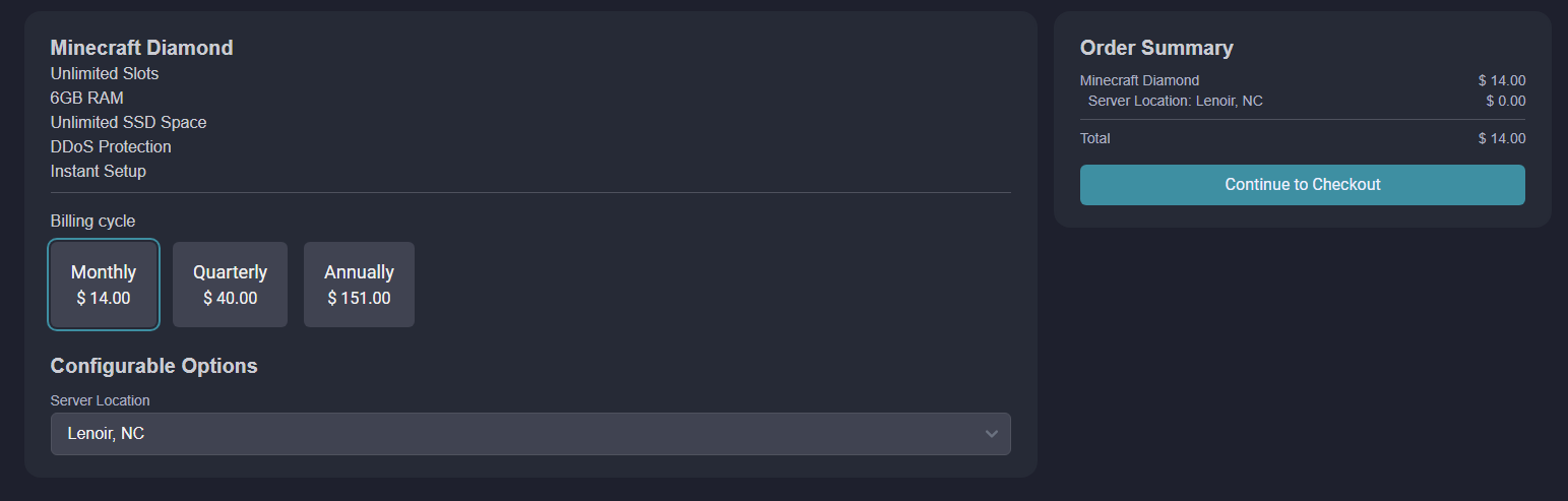 Confirm the Billing Cycle and Server Location and click Continue to Checkout.