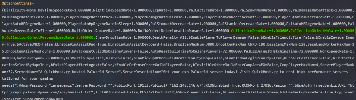 CollectionDropRate=A multiplier rate for the amount of resources gathered from gatherables.CollectionObjectHpRate=A multiplier rate for the amount of HP a gatherable has. More HP means more resources.CollectionObjectRespawnSpeedRate=A multiplier rate for the amount of time it takes before a gatherable can respawn. -